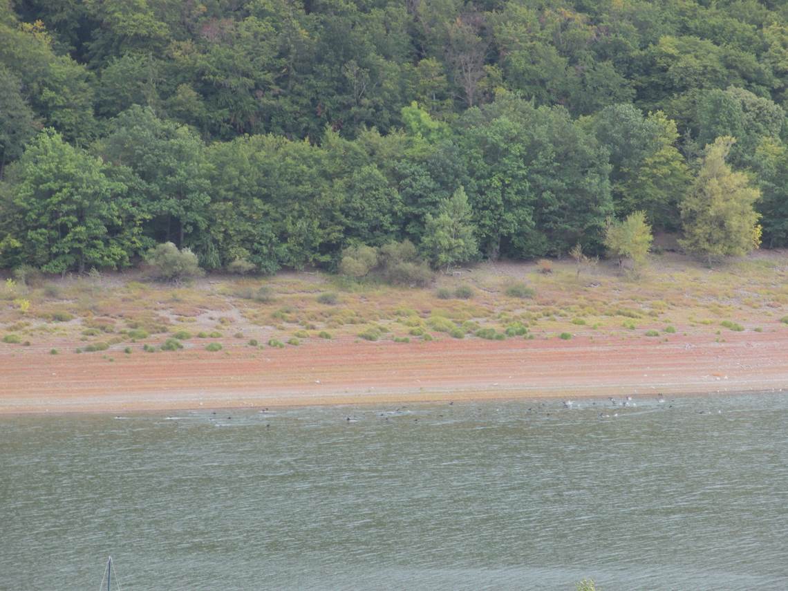 Nach offensichtlich erfolgreichem Fang sammelt sich der gut 200 Tiere starke Schwarm zum Trocknen direkt an der Uferkante, über dem inzwischen wieder überstauten Edertalsperren-Modell.