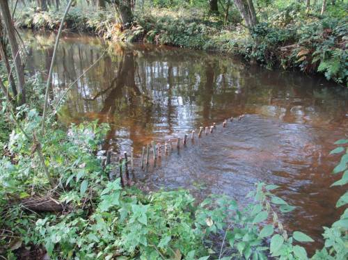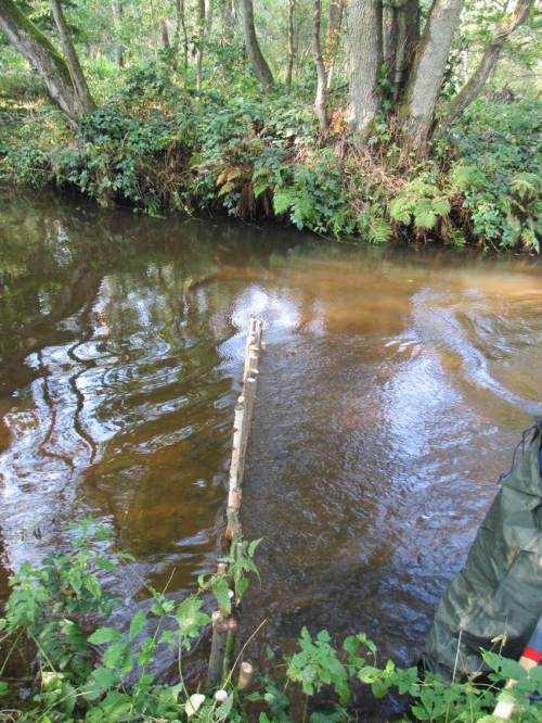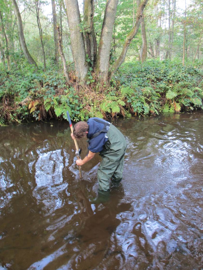 Bis kurz über Mittelwasserführung wird der Haselstecken mit Vorschlaghammer in die Gewässersohle gerammt. Kleine Ursache, große Wirkung – Induzieren von Strömungsturbulenz.