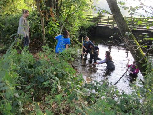 Im vorigen Beitrag sind die Absprachen zur Kiesanlieferung und -Positionierung beschrieben. Nun also hat das Wassercamp der Unterelbeschulen zum 10. Mal im Wildpark Eekholt begonnen mit Gewässeruntersuchungen am ersten Veranstaltungstag. Erstmals soll am 2. Tag mit Kies und Holz restauriert, der Lebensraum der Osterau für Wirbellose und Fische verbessert werden.