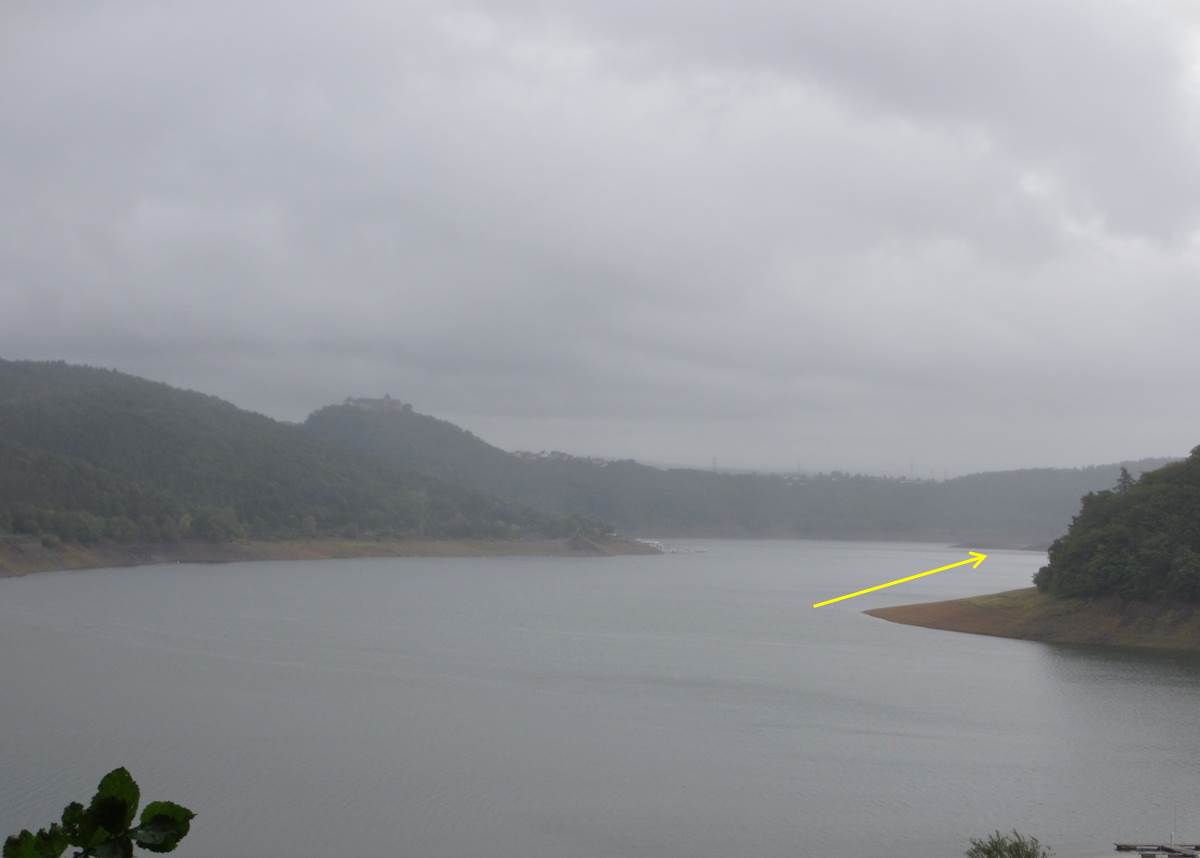 Zwei Tage vorher, Einladung Schöne Aussicht, Halbinsel Scheid, hoffte ich auf gutes Wetter – Ziel: die Hopfenberge (Pfeil).