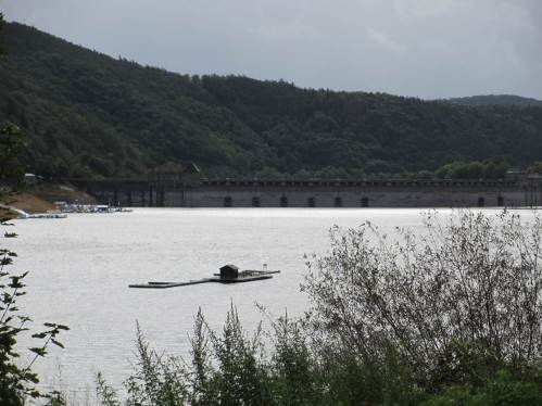 Aufgrund der sommerlichen Regenfälle ist der See wieder so angestiegen, dass die weisse Flotte lange Distanzen abfahren kann. Schloss Waldeck grüßt regenverhangen im Hintergrund.