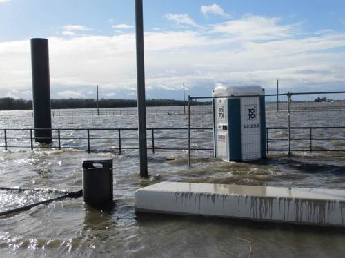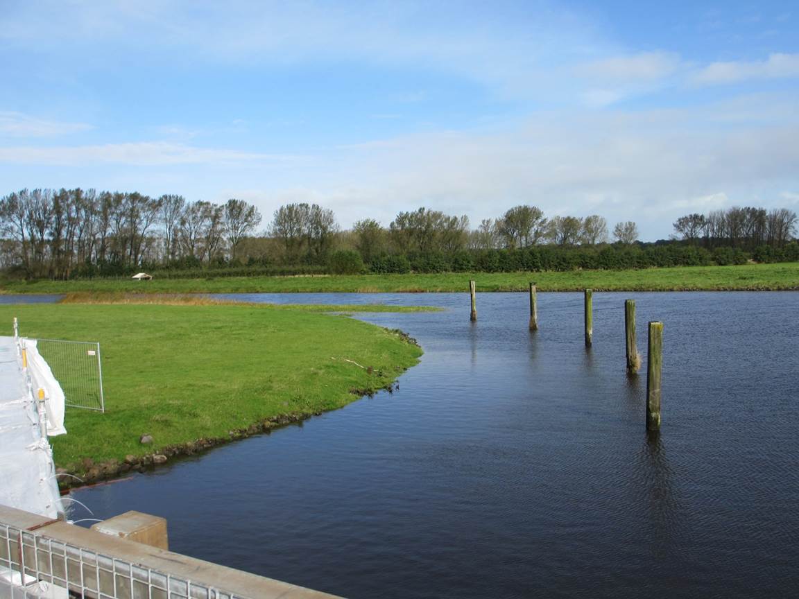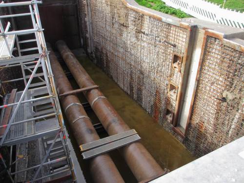 Blick in die Baustelle des Sperrwerks Wedel – Binnenelbe und Wedeler Au werden hierüber entwässert. Mögen die vorübergehend eingebauten Rohre gut dimensioniert sein.