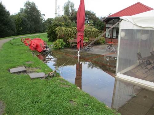 Ausnahmsweise berichte ich mal nicht viel über Bäume, sondern über das Drum und Dran vor und nach Xavier. Es gab auch Wasser, von oben, von aussen (in dieser Jahreszeit sprechen wir hier eher von „viel Wasser“ als von „Sturmflut“, es gab aber doch eine von + 1,50 m über Thw) – aber auch „gut von innen“. Nicht gut ablaufendes Binnenwasser angesichts mehrfach überhöht stehen bleibender Ebbe-Wasserstände liess das Hinterland zunächst feuchter werden. Dann kam zu allem Ungemach auch noch Unglück in Form ausgefallener Pumpen hinzu. – Das Letzte zuerst: Feuerwehr und THW sowie die sich wieder normalisierenden Ebbe-Wasserstände lassen inzwischen aufatmen.
