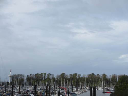 Blick über den Yachthafen – die Silhouette des kleinen Tideauwaldrests scheint keine neuen Verluste anzuzeigen.