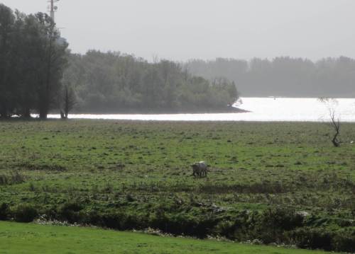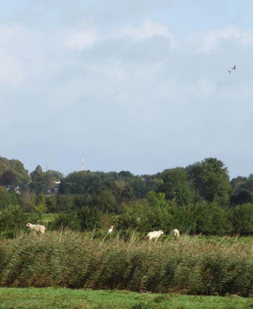 Binnendeichs der Binnenelbe – die Schafe sind vom Hauptdeich in die innere Marsch umgesiedelt. Silberreiher und Graugänse gesellen sich dazu.