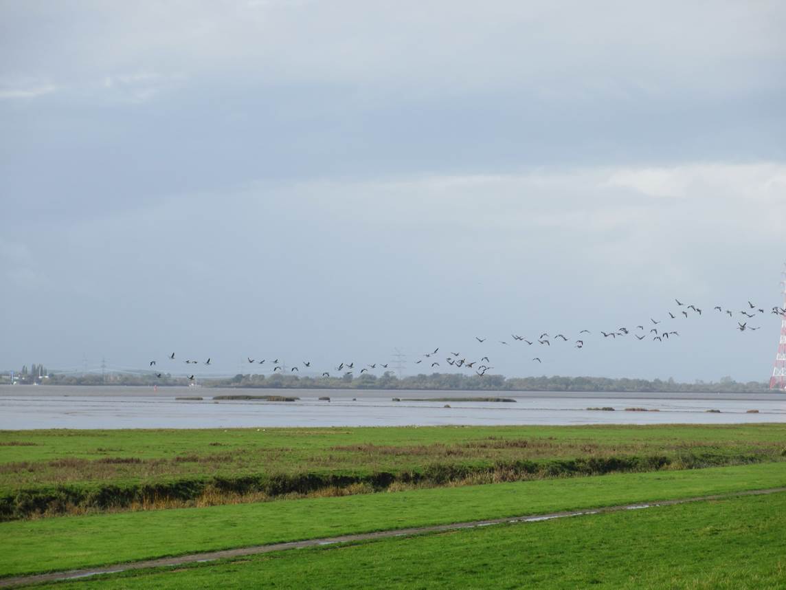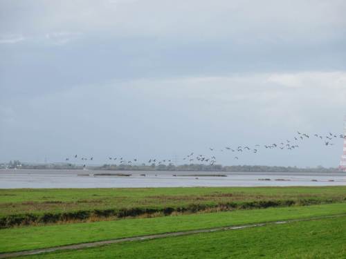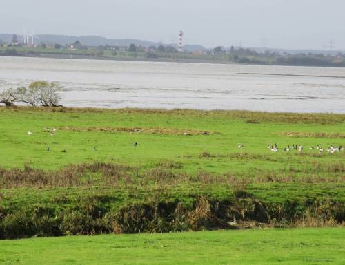 Ich habe mich neulich nicht geirrt. Erste Gruppen Nonnengänse grasen neben Graugansschwärmen im Aussendeich.