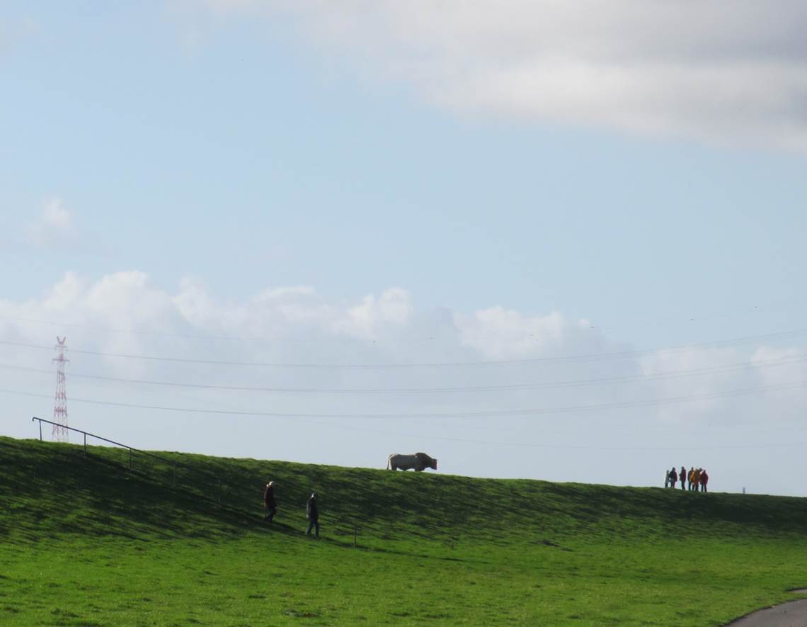 Der Bulle aber orientiert sich – und schliesst sich Freizeitwanderern auf dem Deich an – Richtung heimatlichem Stall, nehmen wir an.