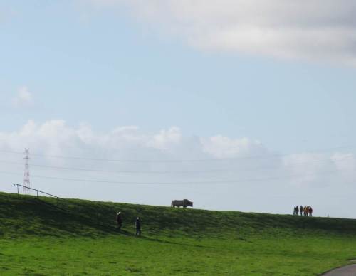 Der Bulle hatte offenbar vom aufgestockten Tide-Geschehen so die Nase voll, dass er den Graben zwischen Aussenbereich und Deichvorland durchquert hat. Auf der Deichkrone fühlt er sich offenbar am wohlsten.