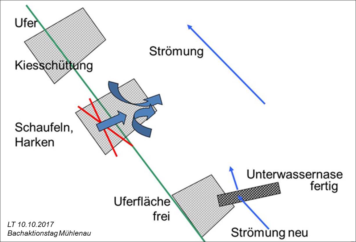 Von der Schüttung zur Lenkbuhne: Waagerechtes Ufer vom Kies befreien, Böschung kiesgeschützt lassen, Unterwassernase harken – soweit das Schema.