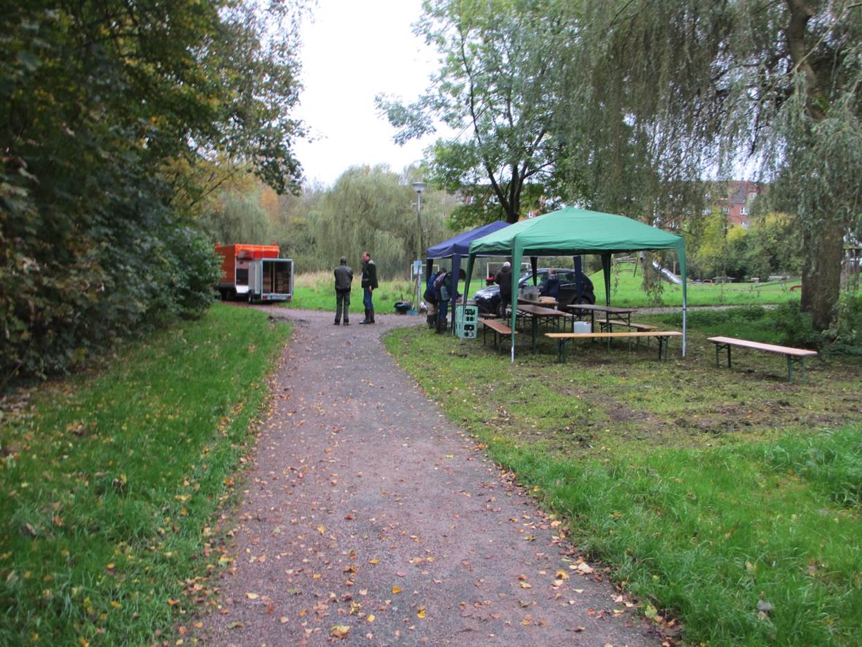 Mühlenau-aufwärts – unser Treff ist aufgebaut, Platz im Freien für weitere Bänke und Tische vorhanden.