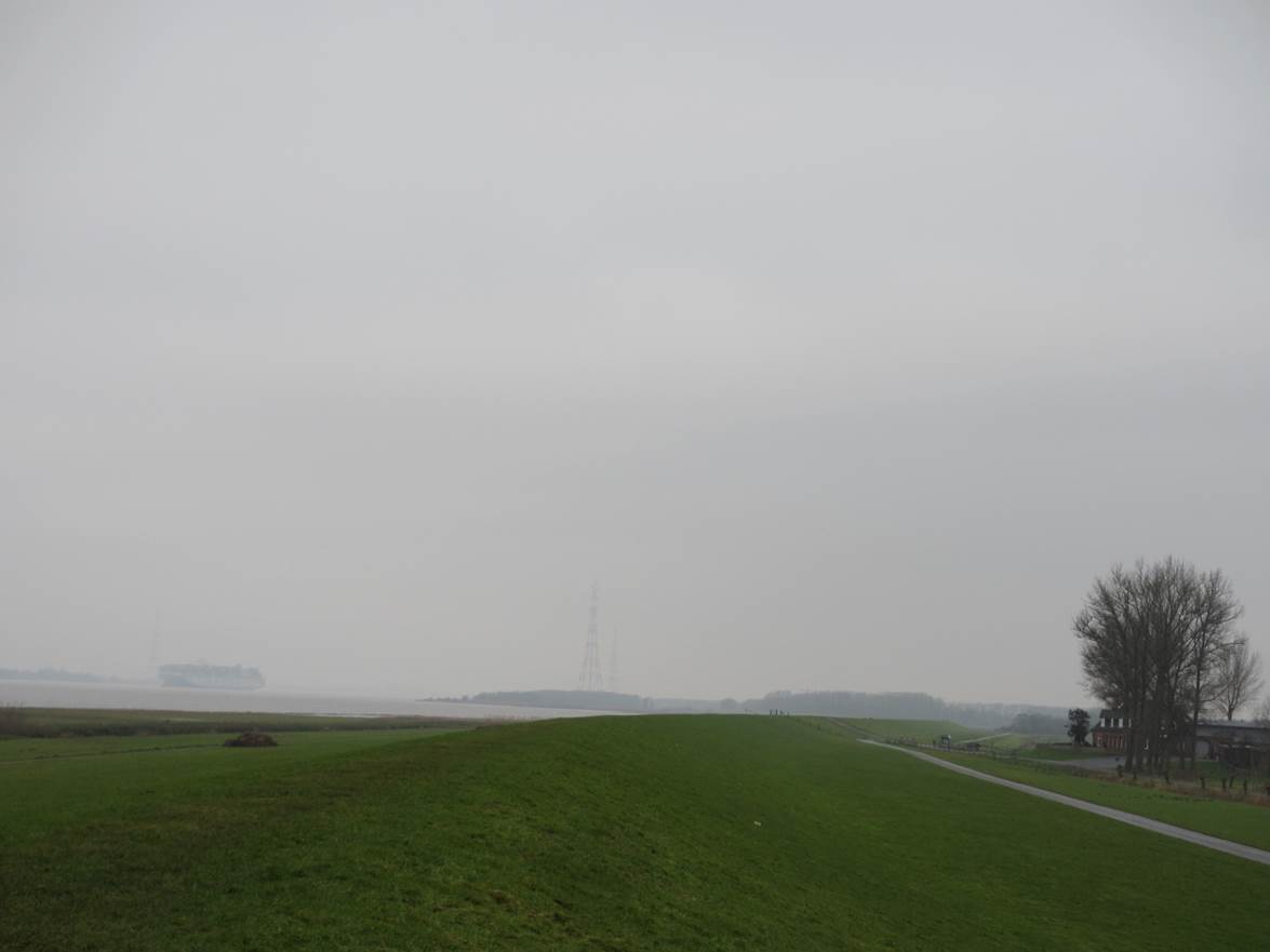 Als wir auf dem Deich ankamen, war Hochnebel aufgezogen, Containerfrachter Cosco Denmark, 264 x 32 m, nur schwach am Horizont erkennbar.