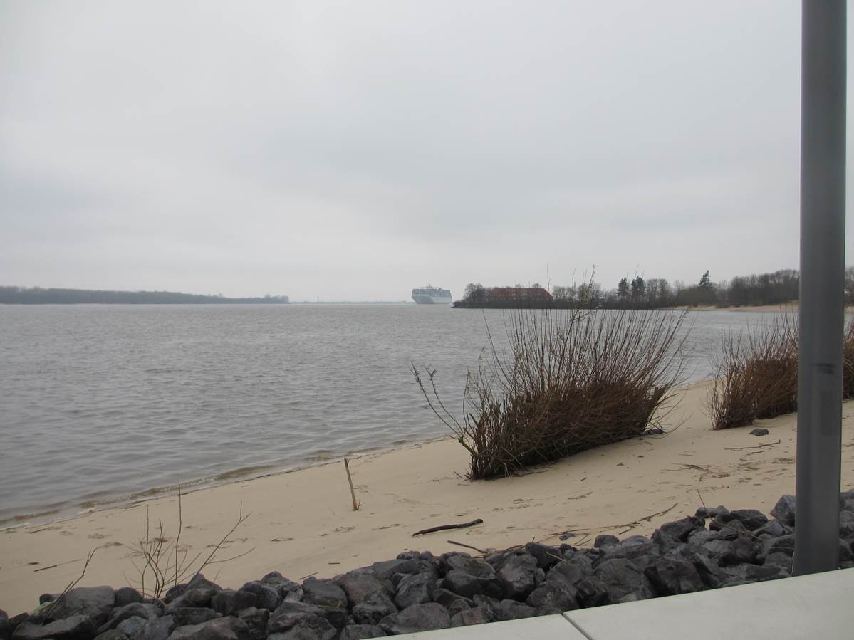 Vom Schulauer Hafen nach Westen guckend war die Größenrelation dieses noch relativ normal „kleinen“ Schiffs gut vergleichbar mit dem Umfeld.