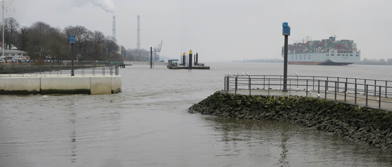 Cosco Denmark hat den Schulauer Hafen passiert. Stark strudelnd und weit drückt „der Schwall“ in die Hafeneinfahrt.
