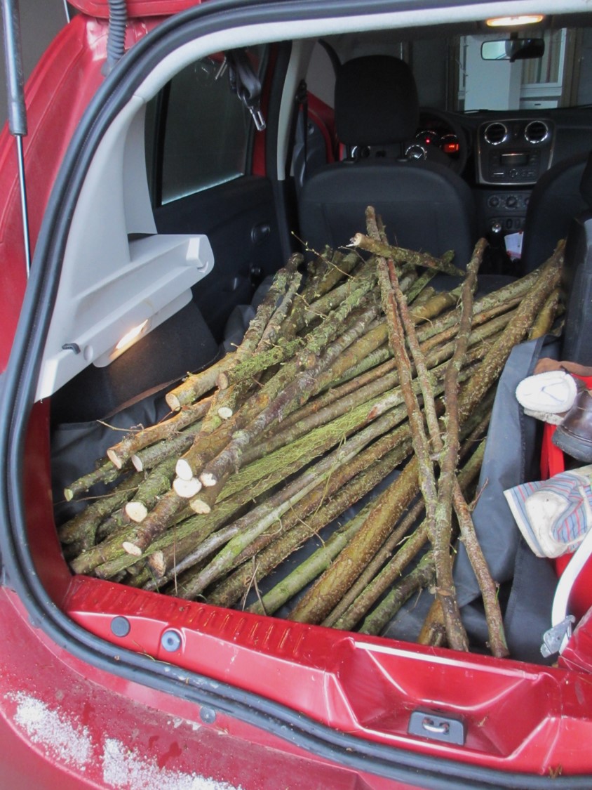 Einen Teil der geraden Haselstecken zwischen 1,0 und 1,5 m habe ich an eine Kooperationsschule zur trockenen Lagerung transportiert.