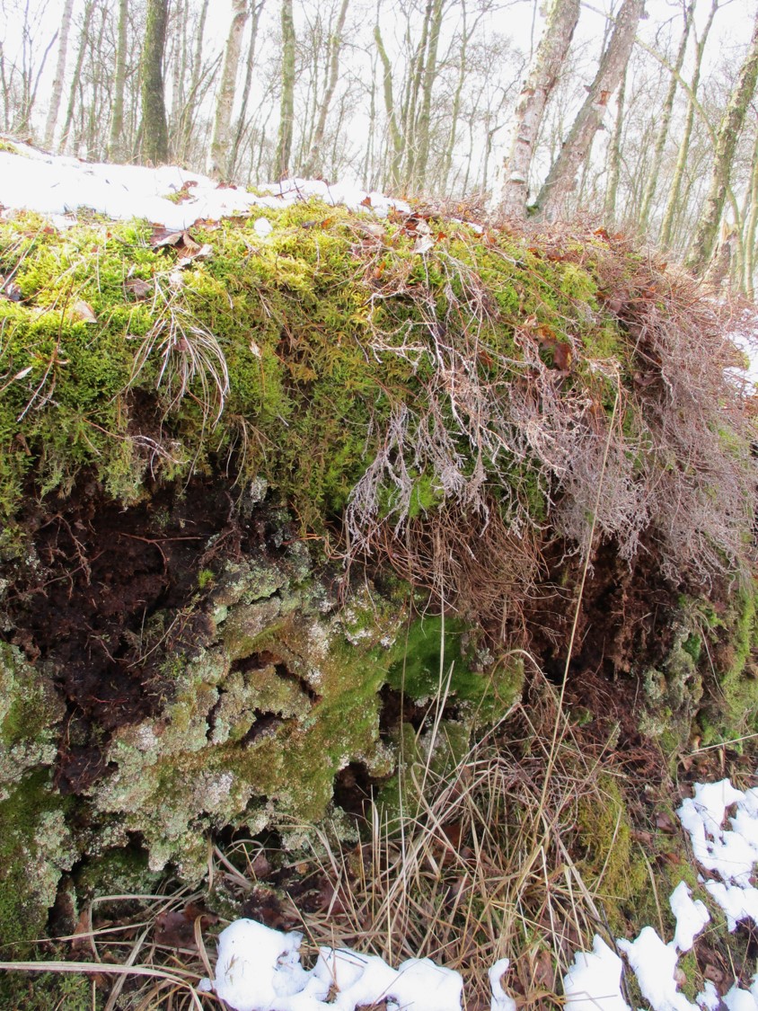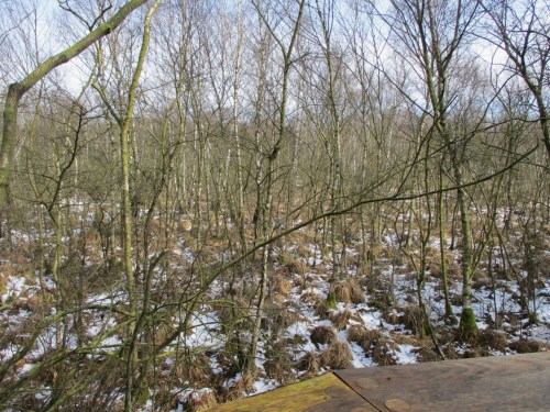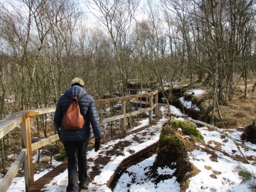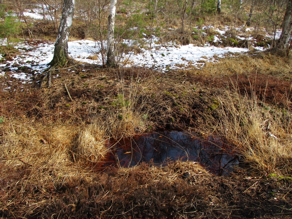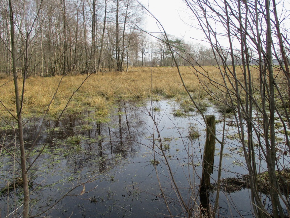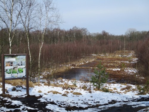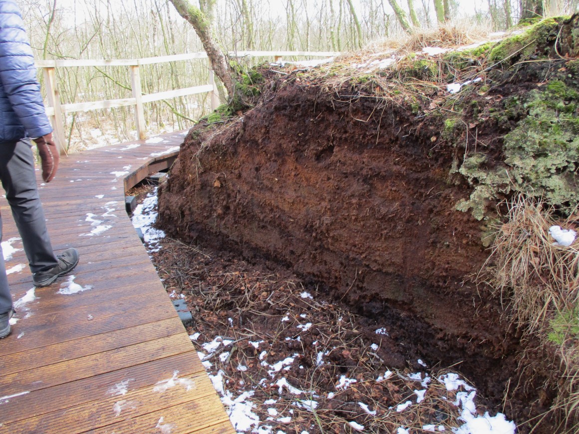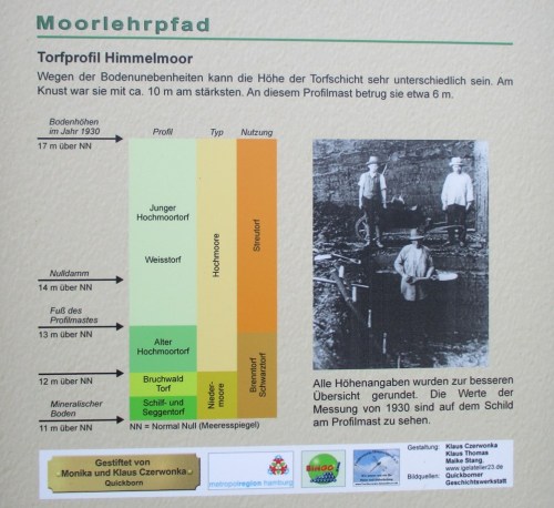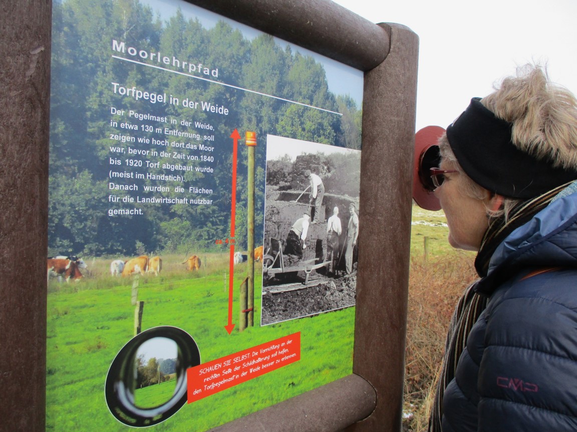 Neben dem Aussichtspunkt variierendes, tieflliegendes Gelände. Tafel nicht gelesen – wir tippen auf alte Torfstiche, damals noch Handarbeit?