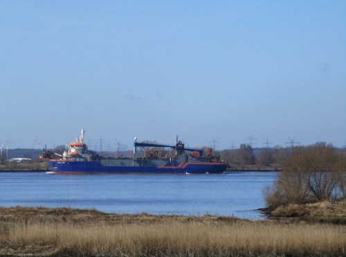 Blick übern Deich. Auf der Elbe nix los mit Schiffen. Nur der im Auftrag der Bundeswasserstaßenverwaltung rastlos Sedimente seewärts verklappende Hopperbagger HAM – was für ein zweifelhaftes „Vergnügen“.