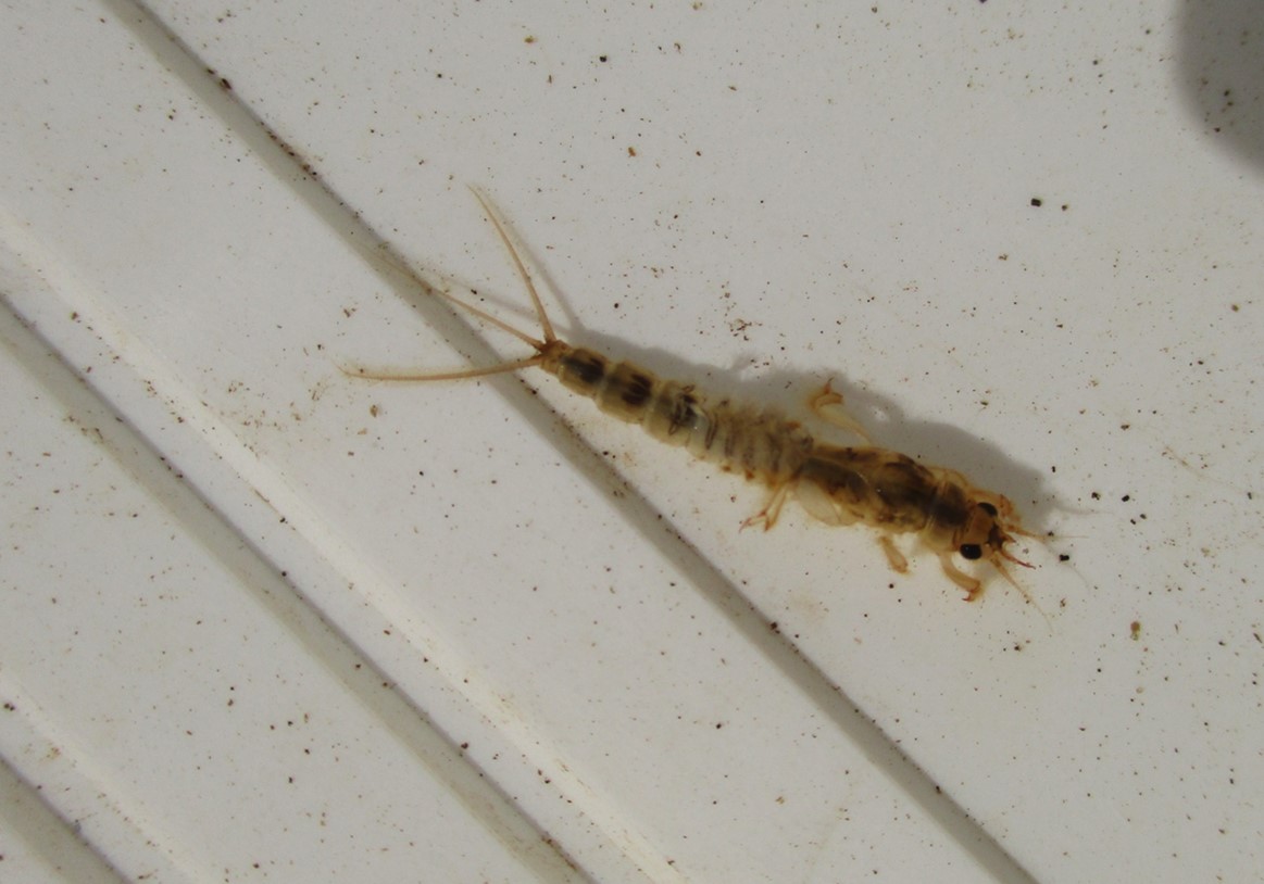 Diverse runde Eintagsfliegenlarven, hier eine mit fadenförmigen Kiemen, finden sich in Kies und an Treibselsammlern.