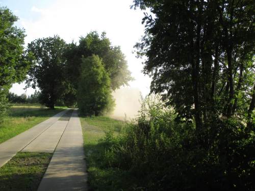 Beim Weiterradeln hüllte uns bald eine Staubwolke ein – „Mutterboden“, feinst, mit allem was an Nähr- und Giftstoffen dranhängt, wird vom Wind über Nachbarflächen verteilt.