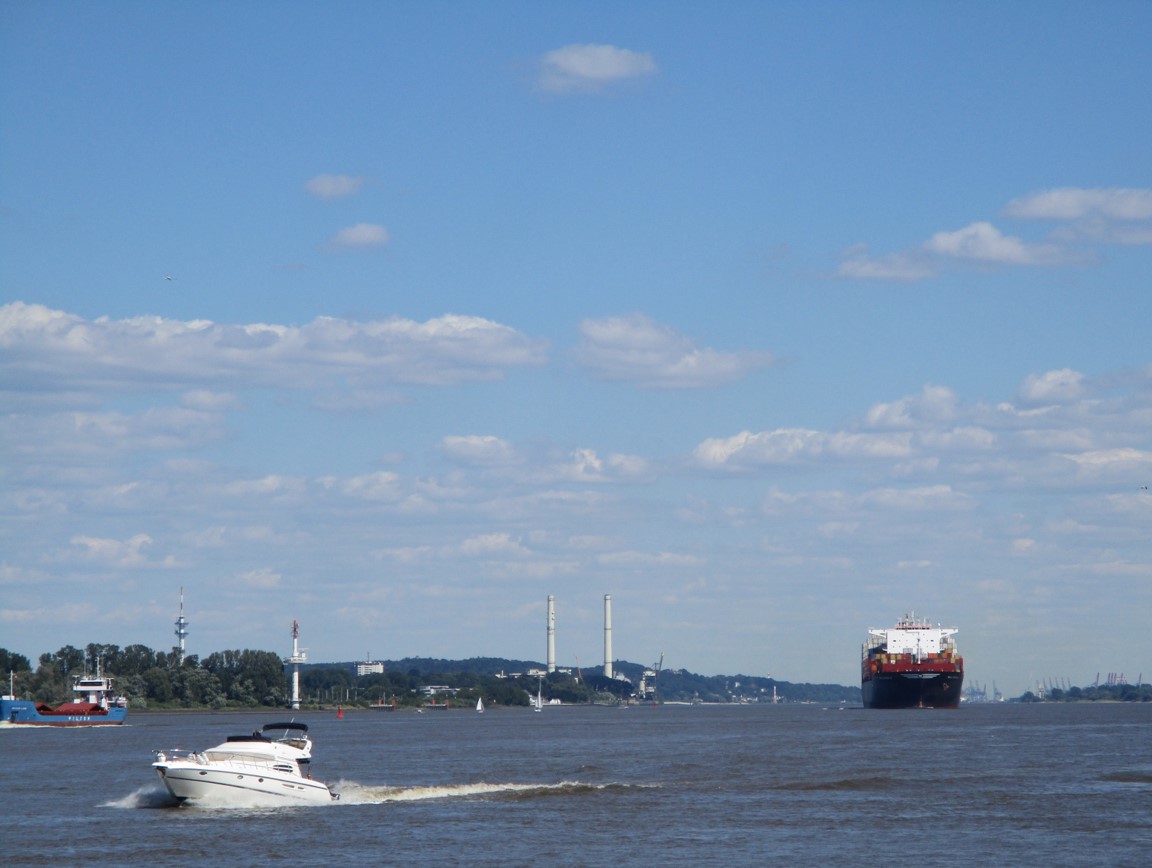 Ein Sportboot und ein Containerfrachter, im Hintergrund der Hamburger, Blankeneser Elbhang.