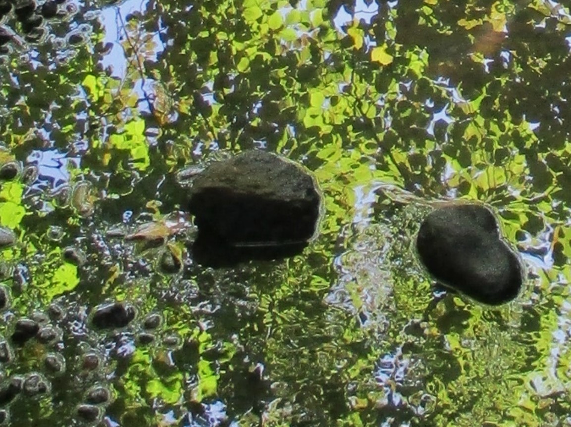 Von oben nach unten: „Der Spiegel“ im Anstrom auf die Störsteine. Spiegel gebrochen – Turbulenz belebt den Bach.
