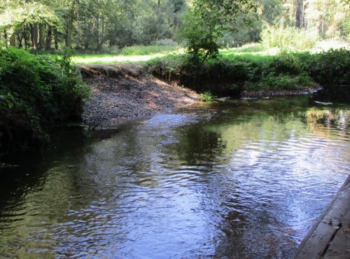 Mit gut geübter Gruppe ist das Ziel, wie das Foto zeigt, schnell erreicht. Die Fischunterstände unter den Erlenwurzeln bleiben erhalten, der Strömungsdruck ist zum Baumerhalt aber vom Ufer weggenommen und zur Bachmitte verlagert.