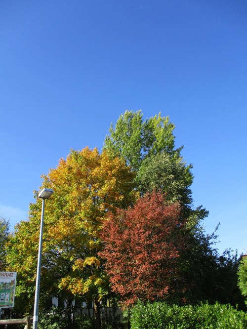 Näheres Betrachten: Es handelt sich um eine im Windschatten von Eiche und Schwarzerle sehr groß gewordene Eberesche / Vogelbeere, die mangels Störungen noch fast alle ihre bunten Blätter hat. Das Umfeld ist ein Beispiel für Baumvielfalt auf kleinem Raum mit Weissdorn und Holunder im Untergeschoss. Hornissen patroullieren eifrig und suchen nach Beute.