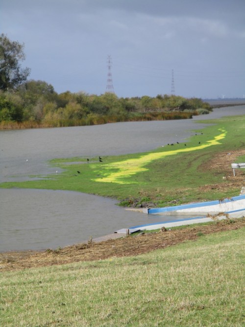 Dann hoffen wir mal, dass das Hellgelbe nichts mit Pestiziden zu tun hat, sondern von der Sturmflut durch Treibselversatz (rechts davon) freigelegt wurde. Länger liegendes Treibsel hat das Gras hell werden lassen.