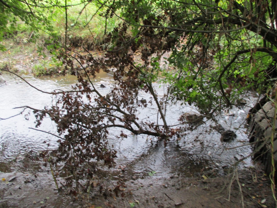 Der Abfluss an der Überfahrt ist wieder frei. Das Bruchstück Kunststoffrohr wird aus dem Bach entfernt und am Ufer gelagert.
