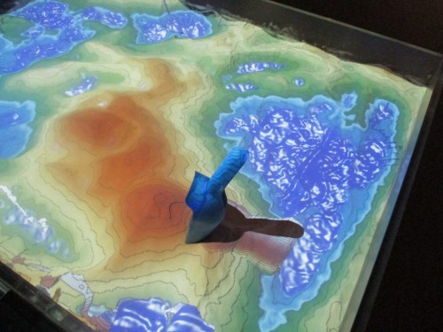 Alles, was die unterschiedlichen Ausstellungen beschreiben, entwickelte sich vor dem Hintergrund tiefgreifender Veränderungen unseres Planeten. Die bunte Sandkiste bietet die Möglichkeit, selbst zu schaufeln. Nebendran werkelte ein Schaufel-Team, das wohl gar nicht verstanden hatte, was da eigentlich geboten wird. Man sprach immer von „Guck mal, jetzt habe ich viel mehr Blau …“ – Dass da wahre Gebirge und Ozeane vor uns liegen, nicht erkannt? – Ich habe mir vorgenommen, das Gebirge mit einem Kratersee auszustatten.