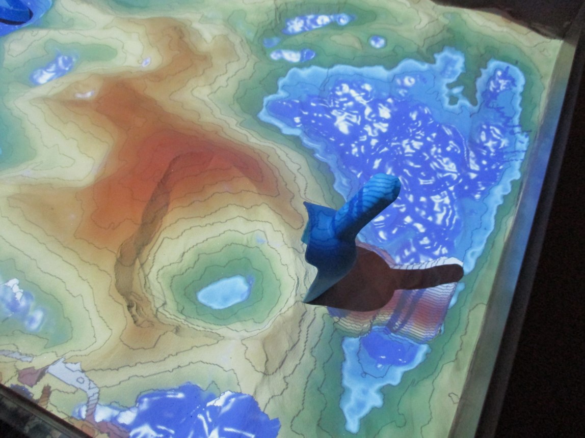 Alles, was die unterschiedlichen Ausstellungen beschreiben, entwickelte sich vor dem Hintergrund tiefgreifender Veränderungen unseres Planeten. Die bunte Sandkiste bietet die Möglichkeit, selbst zu schaufeln. Nebendran werkelte ein Schaufel-Team, das wohl gar nicht verstanden hatte, was da eigentlich geboten wird. Man sprach immer von „Guck mal, jetzt habe ich viel mehr Blau …“ – Dass da wahre Gebirge und Ozeane vor uns liegen, nicht erkannt? – Ich habe mir vorgenommen, das Gebirge mit einem Kratersee auszustatten.