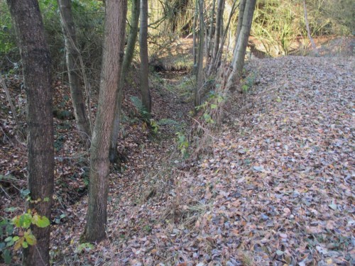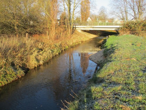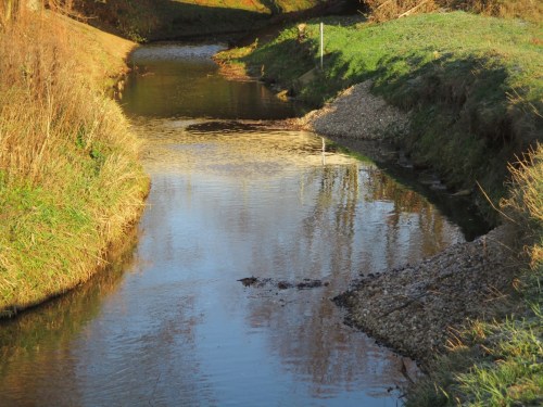 Bachab in Rellingen. Das hier viel tiefer liegende, riesig breite Bett weist kaum mehr Wasser als weiter bachauf auf. Es scheint zu stehen.