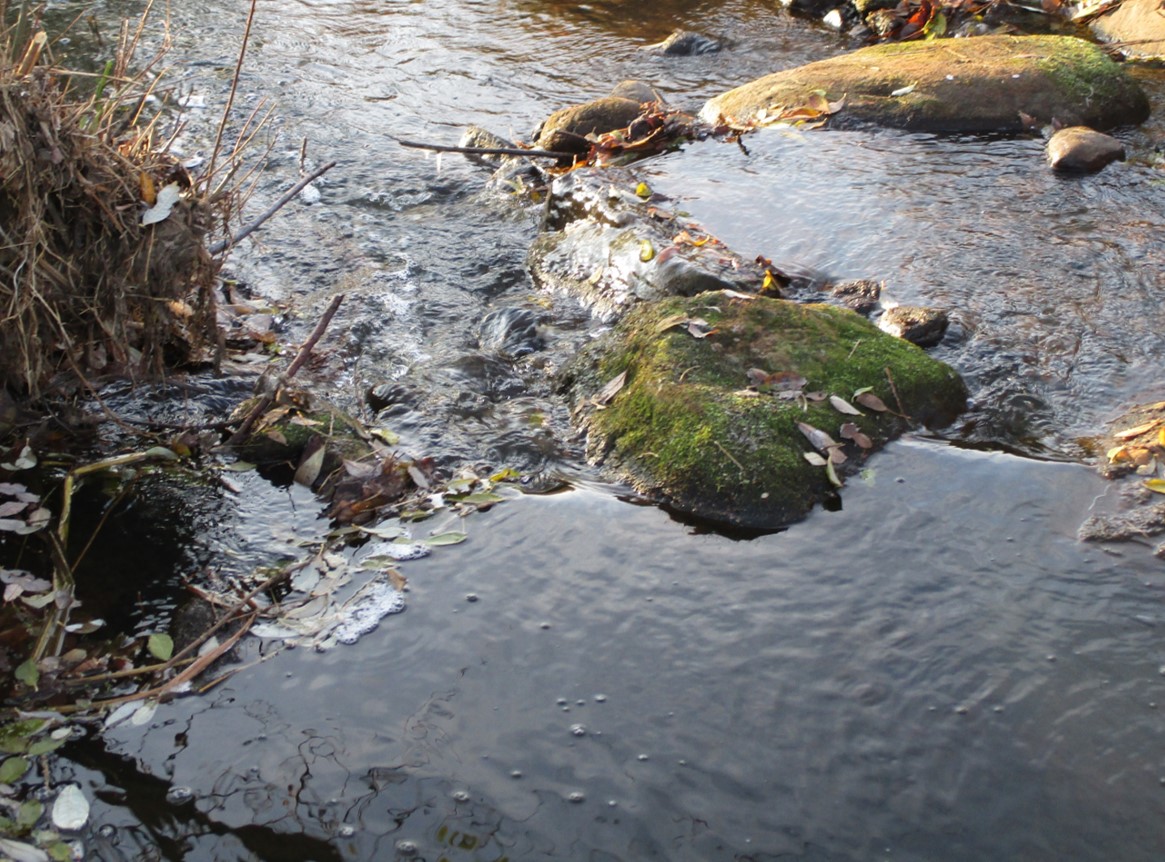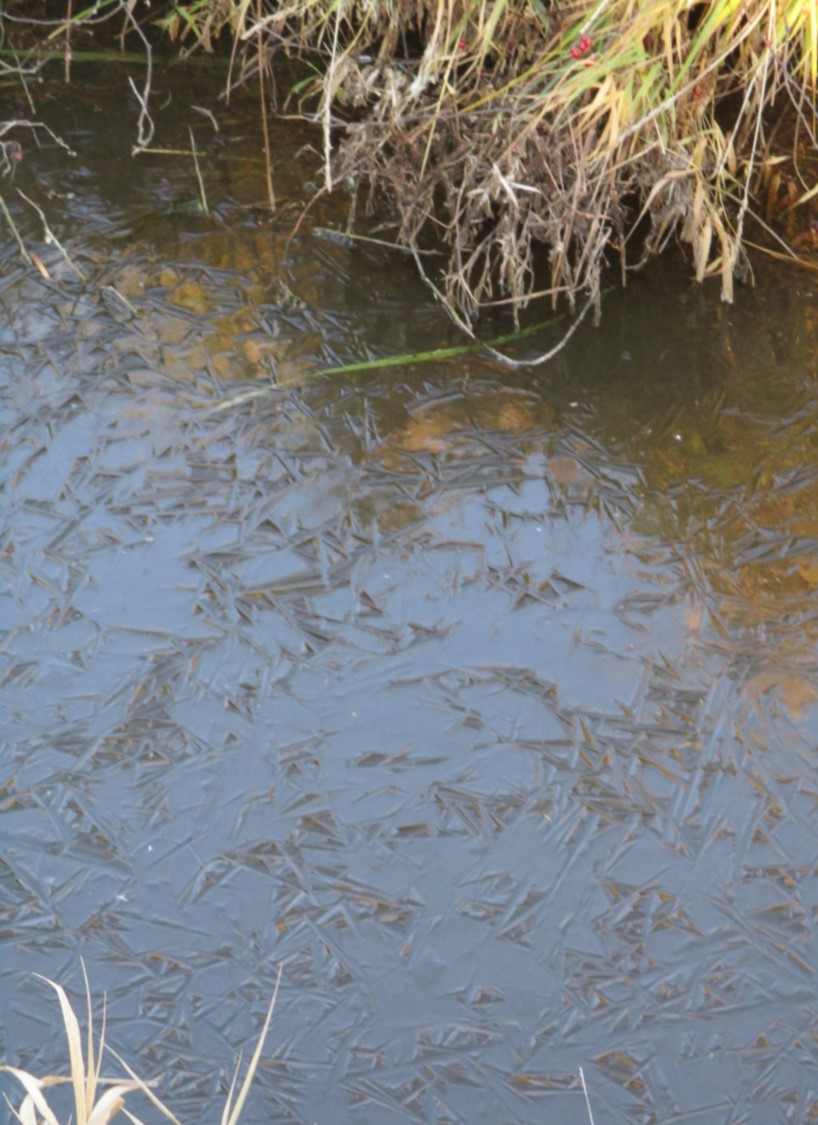 Da „oben“ unter dem Eis sieht es fast so aus, als hätten erste Fische eingebrachten Kies beim Laichen bewegt, „aufgeschüttet“.