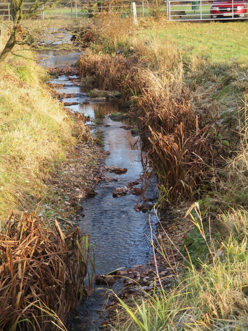 Bachab in Rellingen. Das hier viel tiefer liegende, riesig breite Bett weist kaum mehr Wasser als weiter bachauf auf. Es scheint zu stehen.