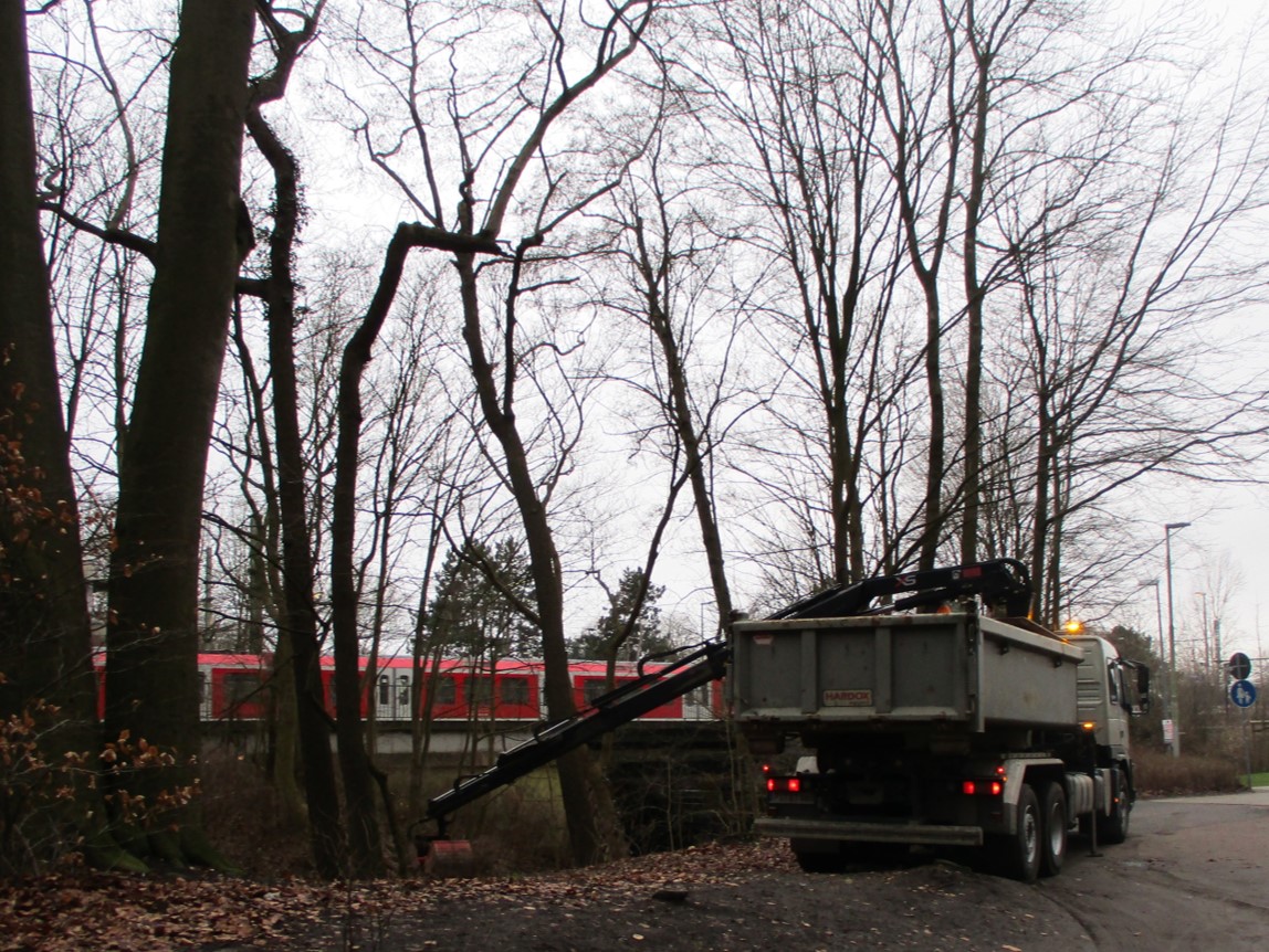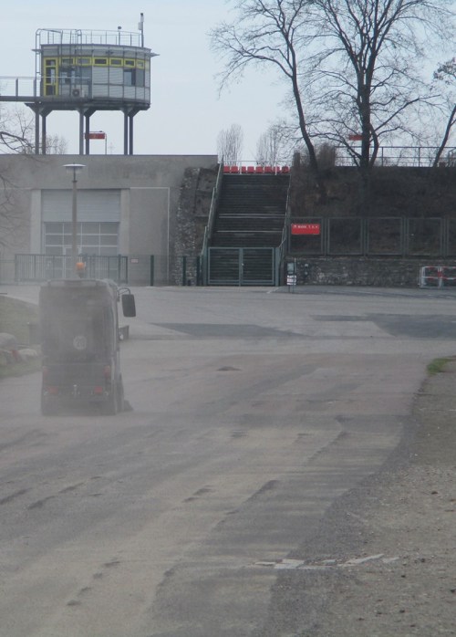 Am Veranstaltungsmorgen bleibt die Sonne erstmal weg. Feinstaubstudien am Sportzentrum – Streukies wird eingefegt und -gesaugt, Feinstaub in Massen produziert. Zum Glück gehe ich im Lee (den Luv-Eindruck überlasse ich der Phantasie der Betrachter).