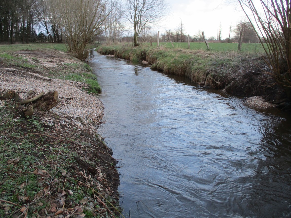 Wir gehen zur oberen Rausche. Die neu erzeugte Turbulenz verteilt sich gleichmäßig in der bekiesten Strecke.