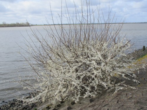 Kleinklima am Elbufer. Angetrieben vom Wärmespeicher Pflaster haben Schlehen und andere Frühlingsblüher „von unten“ her bereits dichten Blütenbestand, oben folgt nach und nach.