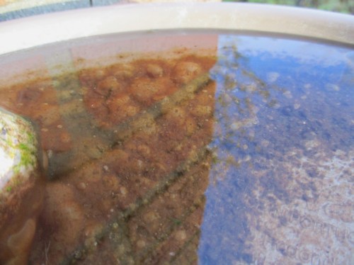 Die Vogeltränke wird nun morgens und ab frühen Nachmittag (dann von links) besonnt – und eifrig zum Trinken und Baden genutzt.