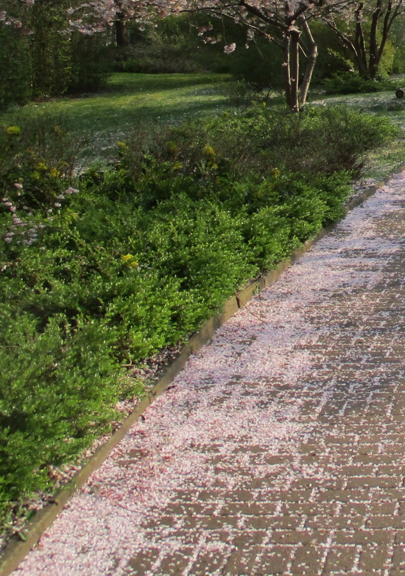 Neulich gingen und radelten wir hier noch unter geschlossener Blütenpracht Japanischer Kirschen, vorbei.