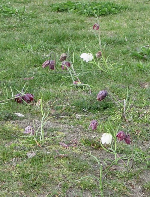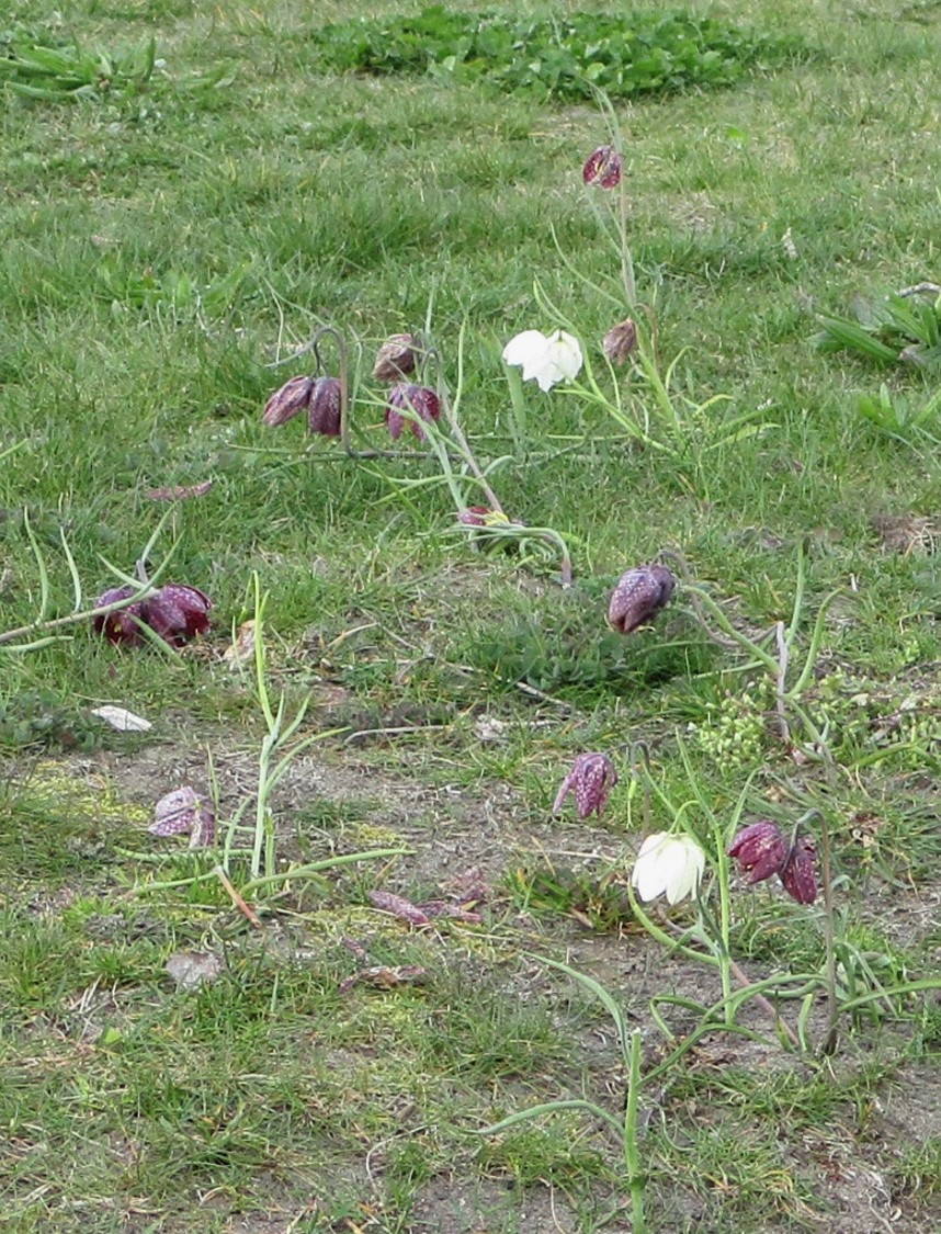 Stopp im Wegradeln – im Augenwinkel … Das geht doch nicht!? Schachbrettblumen blühen am Schulauer Hafen, nette Pflanzidee.