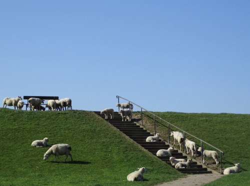 Kein Treppenwitz – vor dem Besucheransturm zu Ostern schlaffen die Deichschafe nochmal ordentlich ab. Schubbern, ruhen, Schatten suchen (dummer Weise so gut wie keiner da).