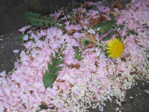 Kopf hoch – ah, die Japanische Kirsche. Die weissen Blütenblätter stammen von der ausladenden Traubenkirsche (Prunus padus) daneben.
