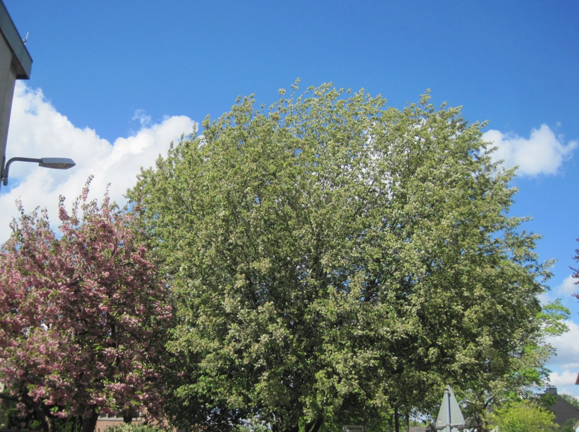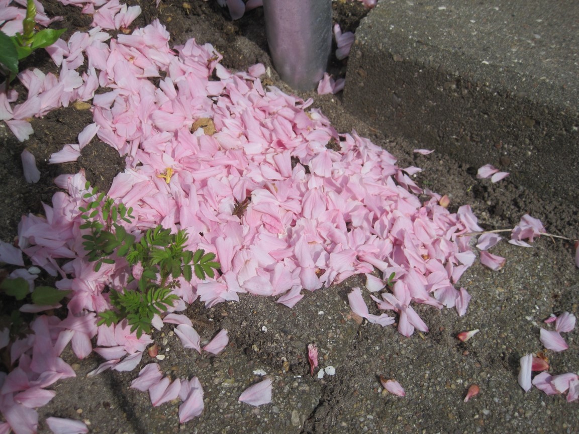 Kopf hoch – ah, die Japanische Kirsche. Die weissen Blütenblätter stammen von der ausladenden Traubenkirsche (Prunus padus) daneben.