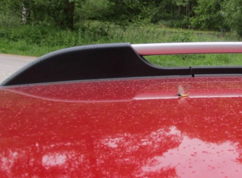 Auf dem Parkplatz begrüsst uns … – Ephemera, die Große Maifliege, zahlreich. Irgendwie gefällt den Insekten unser Autodach. Fast könnte man meinen, hier wollten sie ihre Eier ablegen.