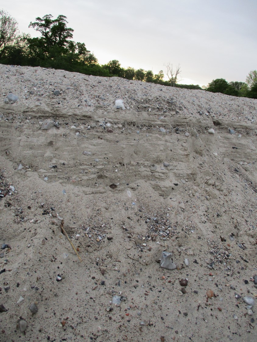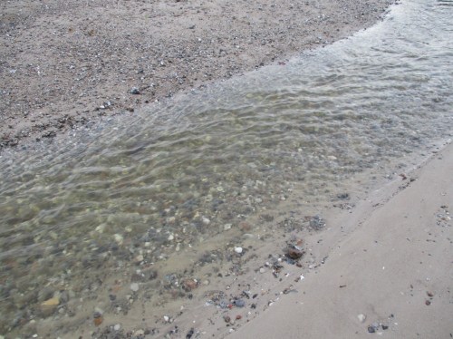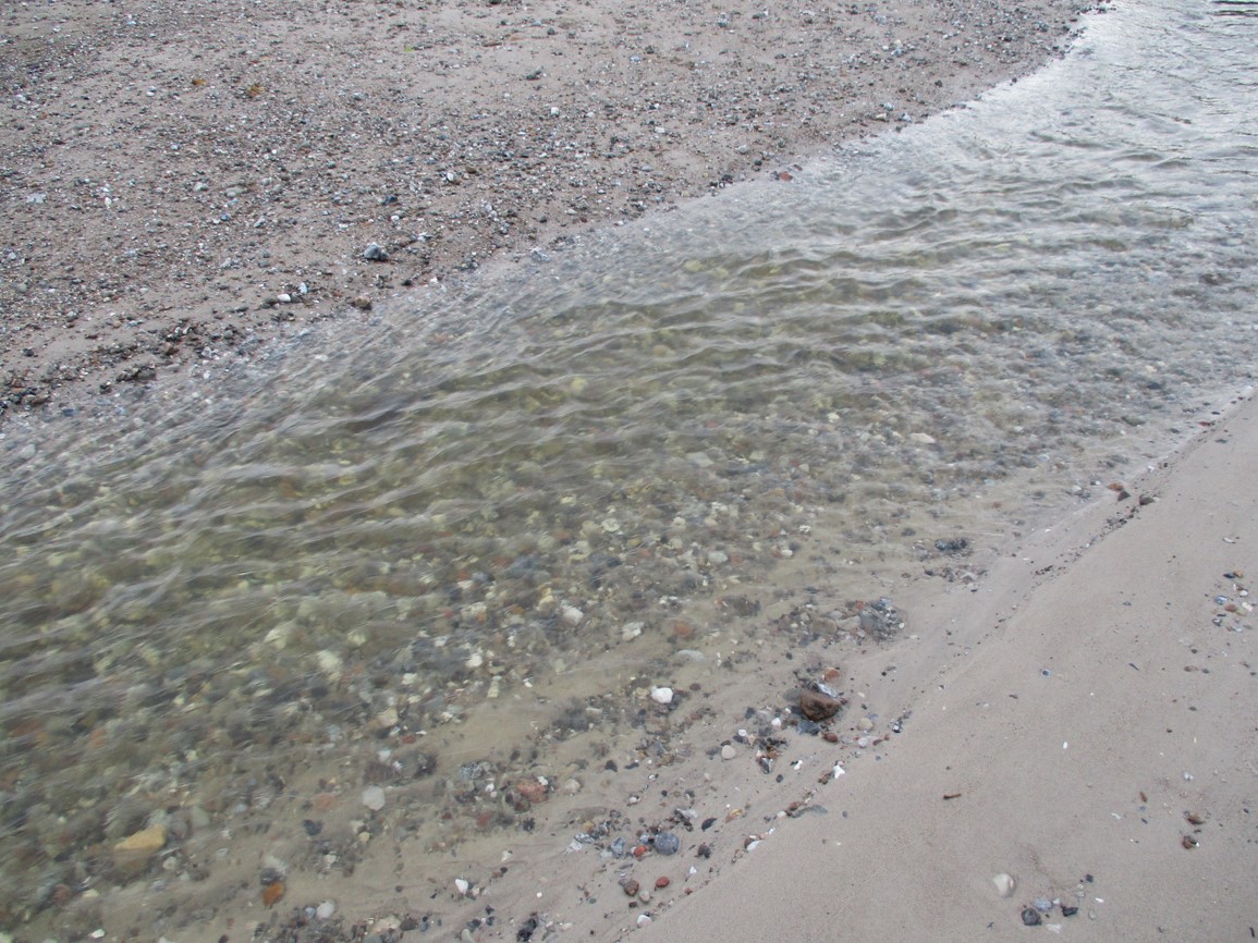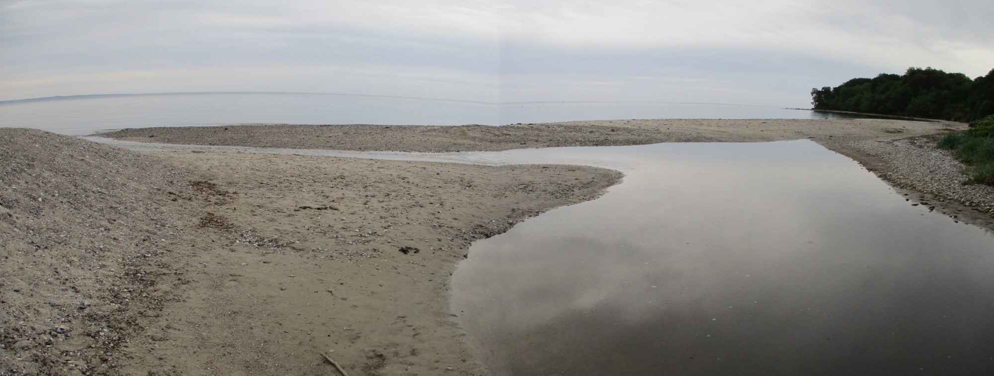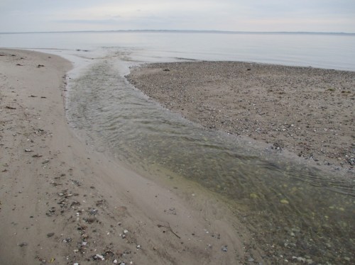 Am Durchbruch des Strandwalls zeigt das Wasser seine Sortierkraft und gewinnt hier den ursprünglichen Steingrund wieder.