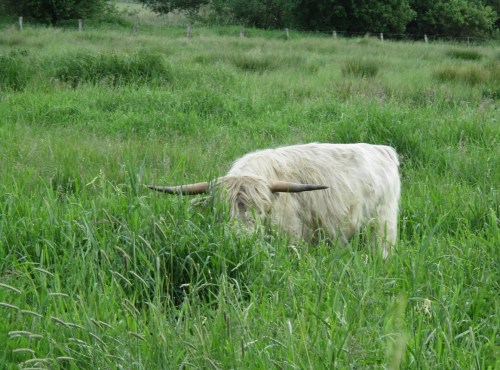Meine Güte, ich seh` ja fast nichts, meint das Schottische Hochlandrind. – Voriges Jahr um diese Zeit sah das ganz anders aus, freier Blick und nix zu fressen.