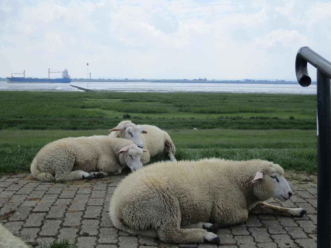 Ach, ist das schön in leichtem Wind auf der Deichkrone besonnt zu werden – Schafe vor Süßwasserwatt Fährmannssand, Tnw Elbe.