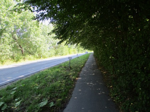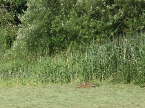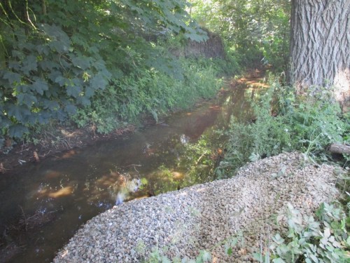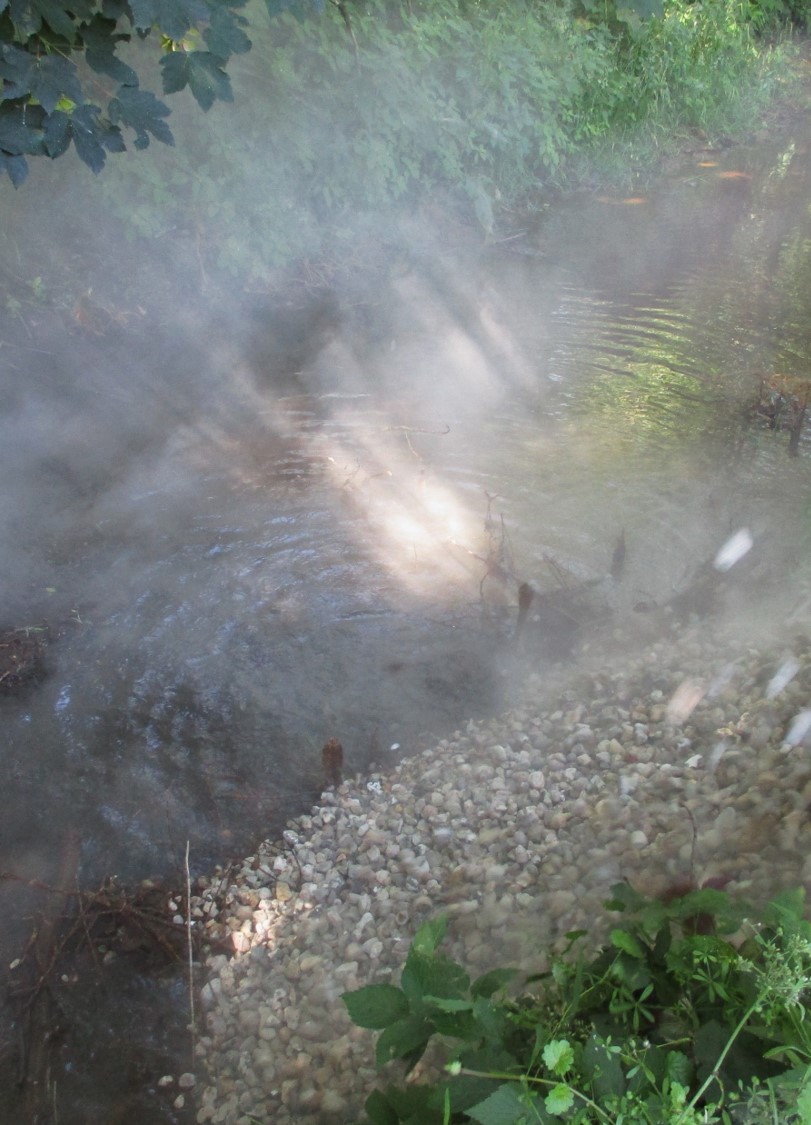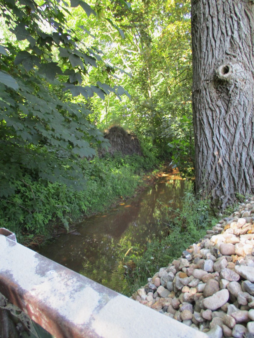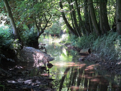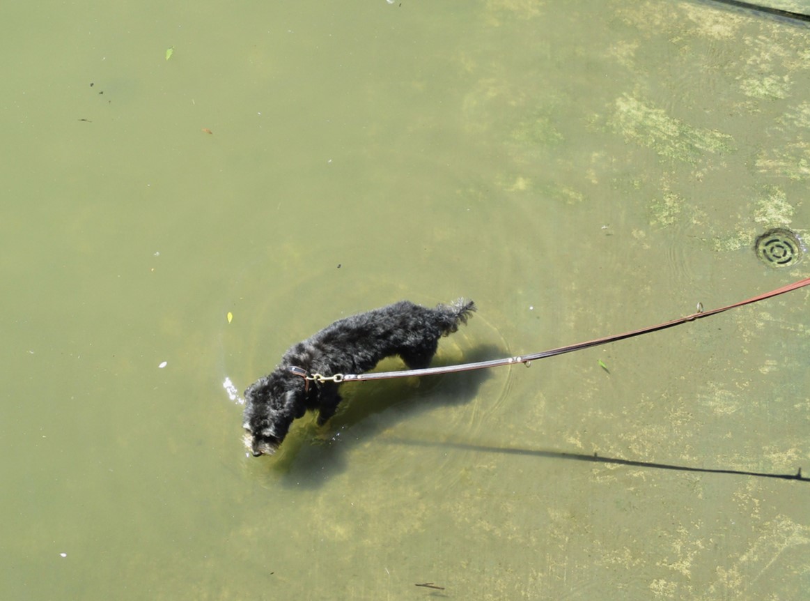 Im Abradeln: ein Dackel-Mix macht das einzig Vernünftige, Abkühlung suchen und finden.