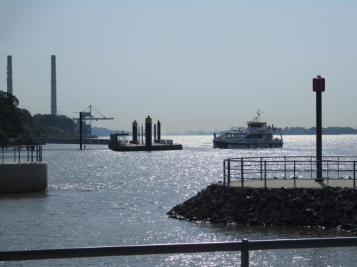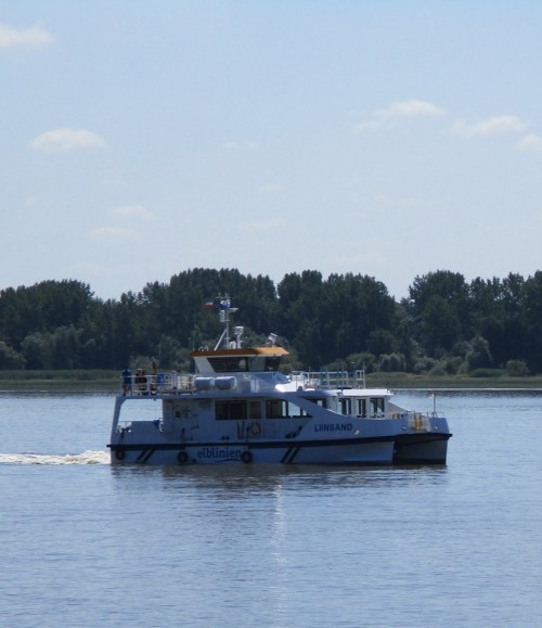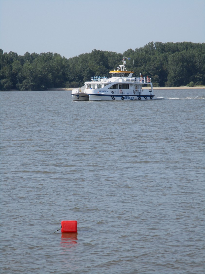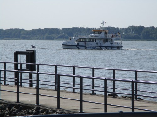 Und da kommt planmäßig die Lühe-Schulau-Fähre, möchte ihre Passagiere aussteigen lassen.
