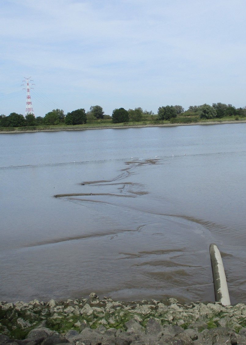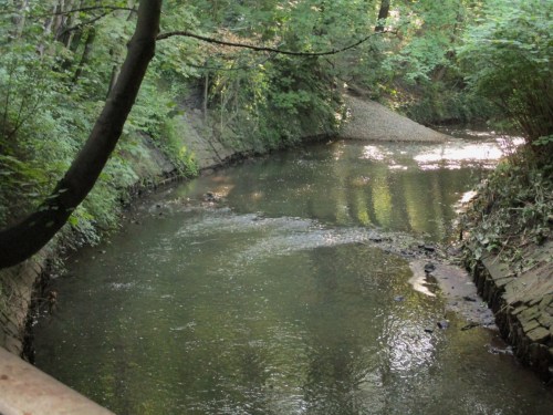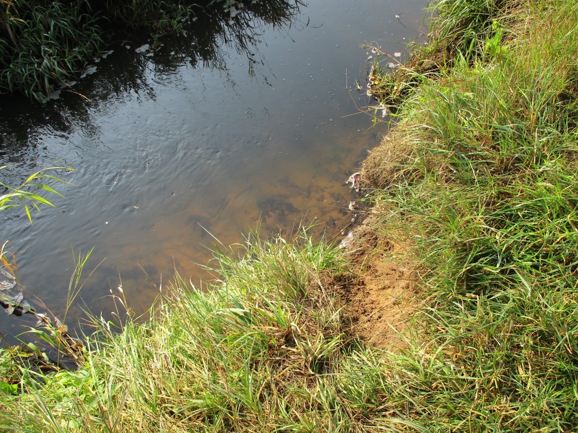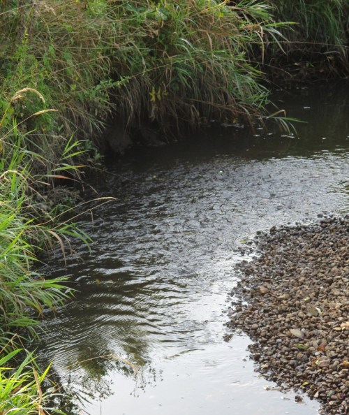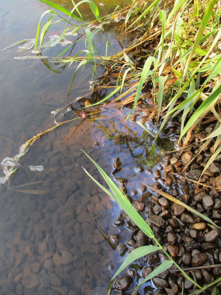 In den Bach eintretendes Sickerwasser, erkennbar an der „Kahmhaut“ Eisen, ausfallend bei Sauerstoffzutritt, und der punktuellen Ockerverfärbung auf dem Kies.