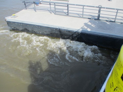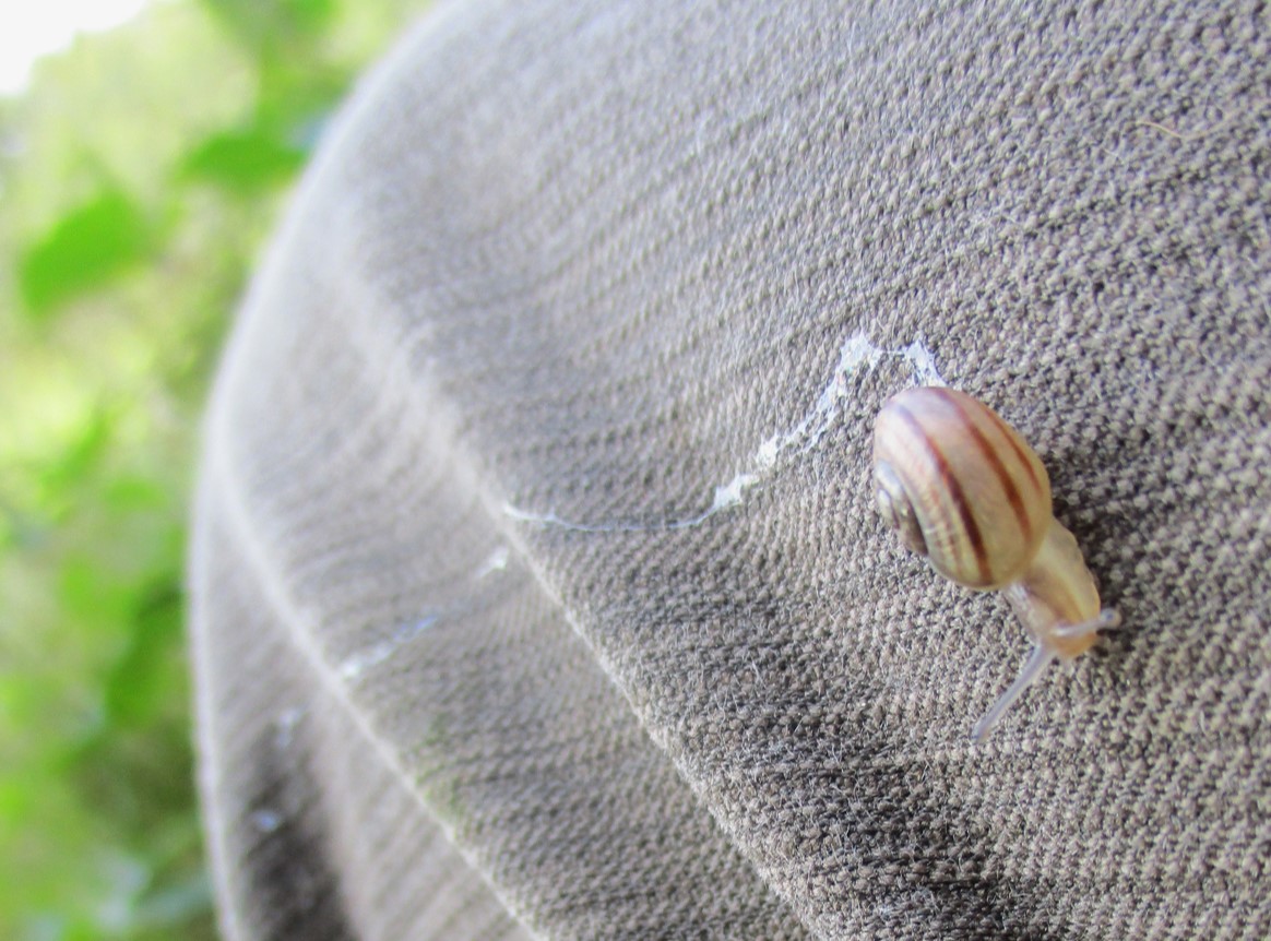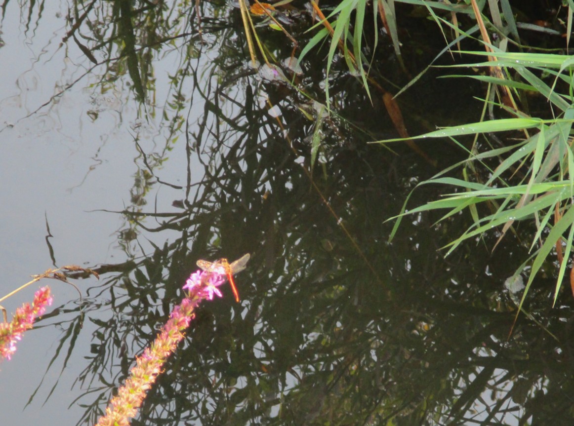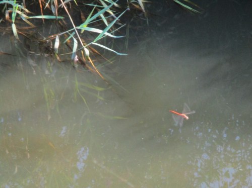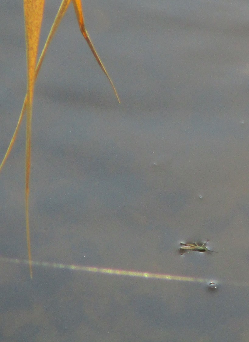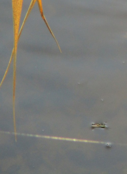 Einer der sehr zahlreichen kleinen Grashüpfer (es sind auch große und noch größere da) ist ins Wasser gesprungen – willkommene Sommernahrung für die Fischwelt.